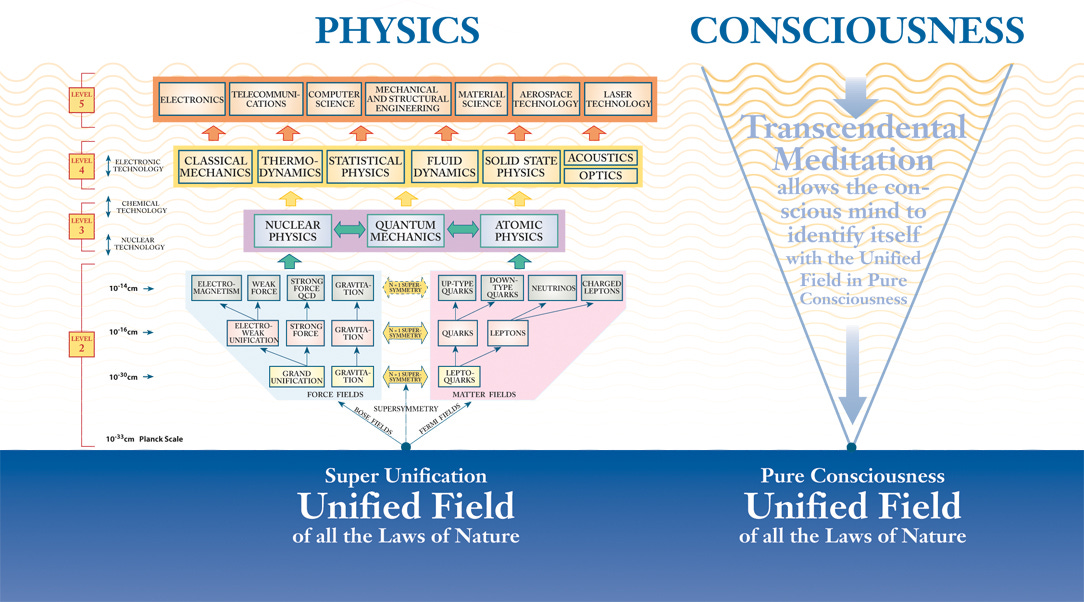 Stromme’s paper looks like an extraordinary intellectual achievement, and I don’t mean to imply false equivalence, but in terms of my own experience of these questions, her paper also reminds me of the ‘Consciousness is the unified field’ arguments arising from the Maharishi World of ‘Vedic science’. I practice TM, and I have applied my mind to its theoretical basis, but I am not qualified to pronounce on its veracity. Images like the one below always struck me as broadly plausible, but difficult to entirely trust due to the connection between a scientific worldview and a particular practice of mantra meditation or vedic sound meditation that had a pre-commercial life as indigenous knowledge, but is now being sold as a trademarked product/service called Transcendental Meditation by an international organisation. (*They would argue this is necessary to protect the purity of the knowledge and that TM teachers are not typically high-earners*).
